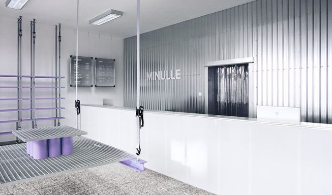 steel grates suspended from ratchet straps turn into furniture for bratislava photo lab